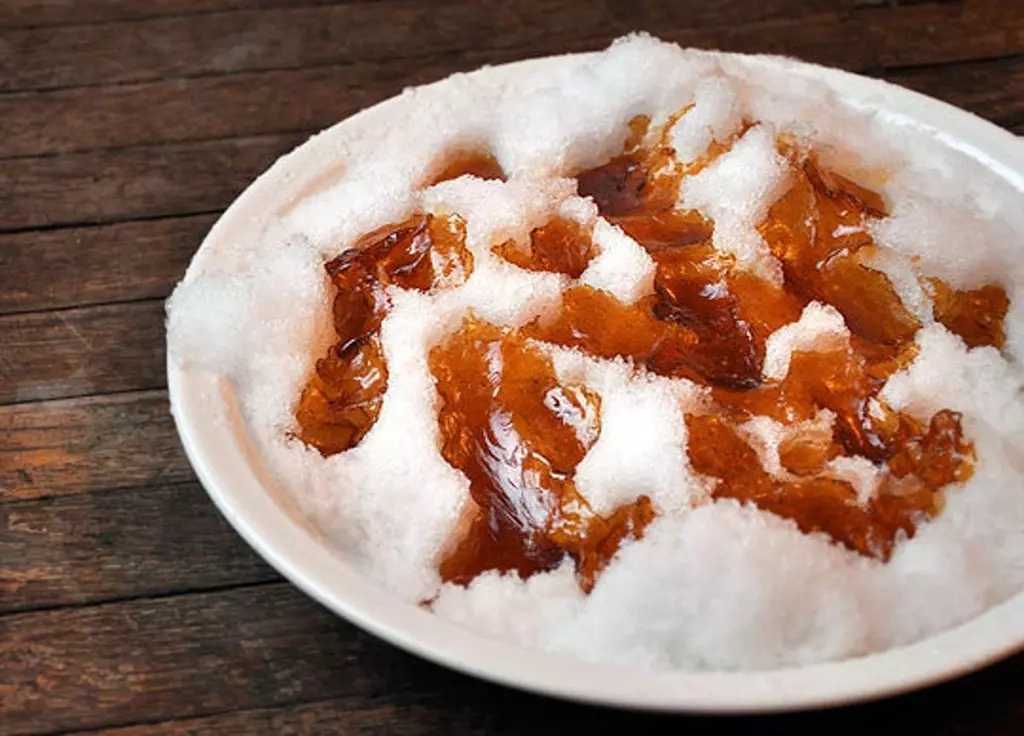 You and your family will love sugar on snow —a traditional and delicious New England treat. Hot maple syrup is drizzled onto snow or ice and hardens into a taffy-like candy.