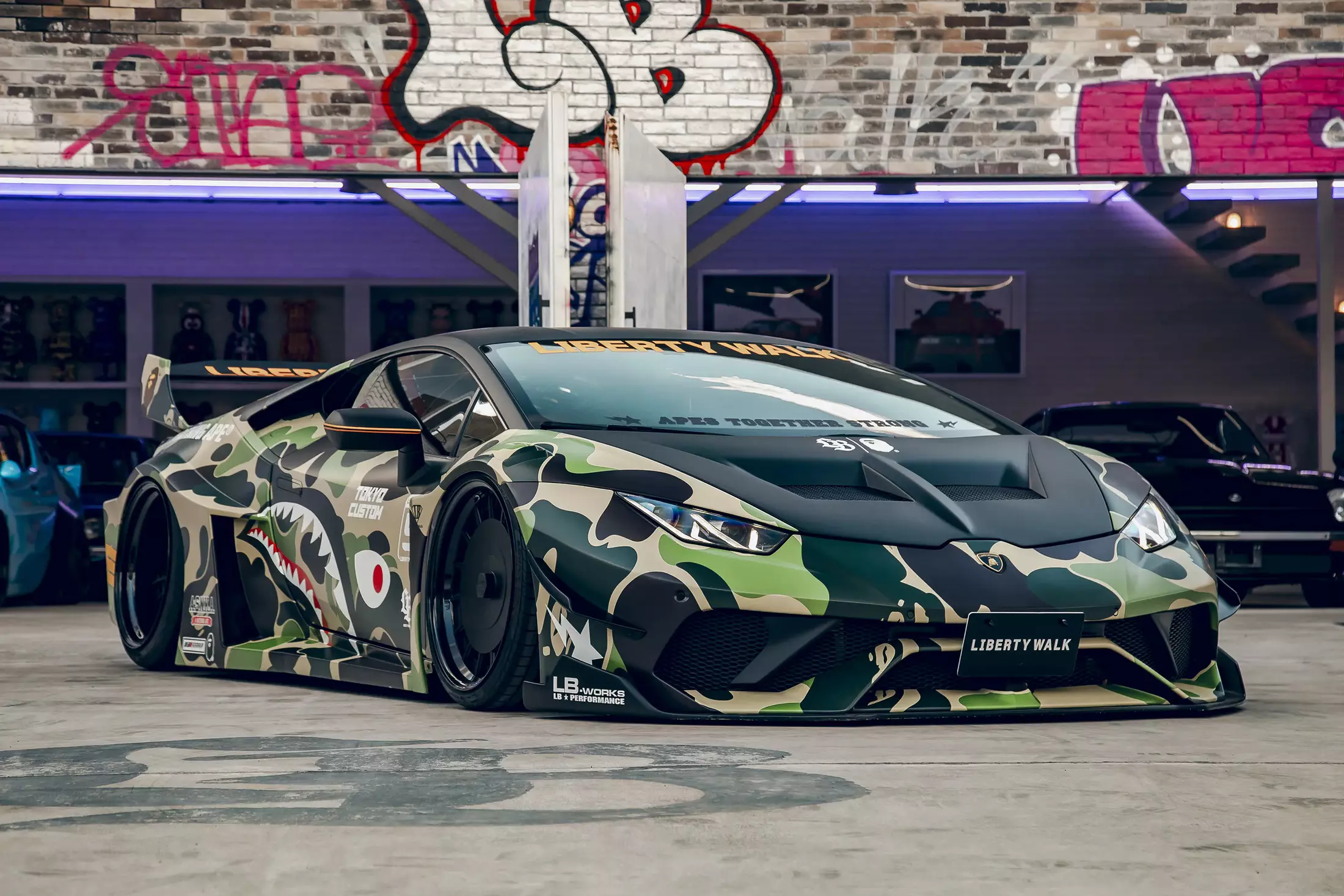 Available from November 1, the Liberty Walk drop channels the spirit of custom car culture. A centerpiece jersey printed in ABC CAMO green carries the Liberty Walk logo and a graphic of a custom Lamborghini, blending motorsport aggression with luxury precision.
