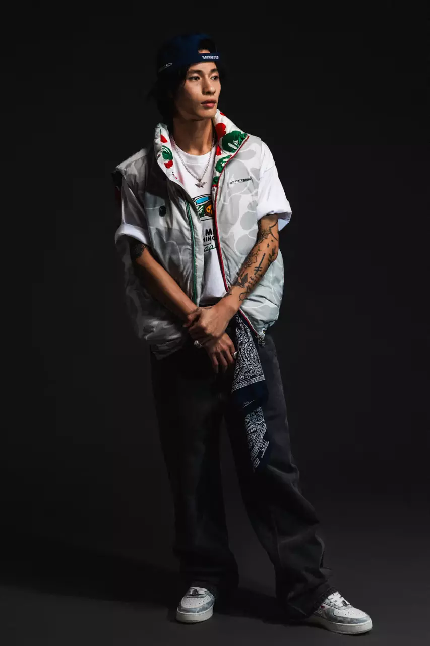 The Pagani capsule fuses automotive artistry with Japanese street design. Highlights include a full-zip track hoodie and Baby Milo tees featuring Pagani’s mechanical iconography reimagined through BAPE’s playful lens.