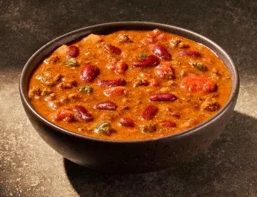 A rich chili made with beef, kidney beans, fire-roasted tomatoes, and green chili peppers, simmered in a flavorful broth with chili spices and cilantro.