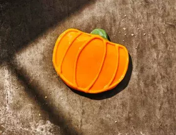 Deliciously crafted, pumpkin-shaped shortbread cookie decorated with icing.