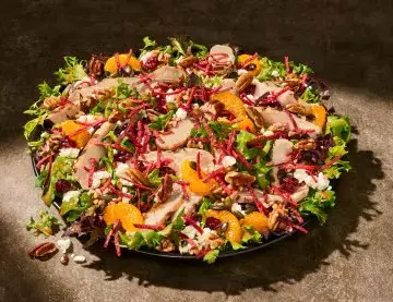 Mixed greens and fresh arugula tossed in balsamic vinaigrette, topped with whole grain blend, grilled chicken, mandarin oranges, feta, dried cranberries, pumpkin seeds, toasted pecans, and crunchy beet strips.