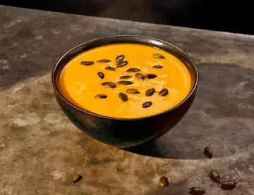 A Panera seasonal classic featuring butternut squash and pumpkin blended with vegetable broth, honey, apple juice, and warm spices like cinnamon and curry, finished with sweet cream and topped with roasted pumpkin seeds.